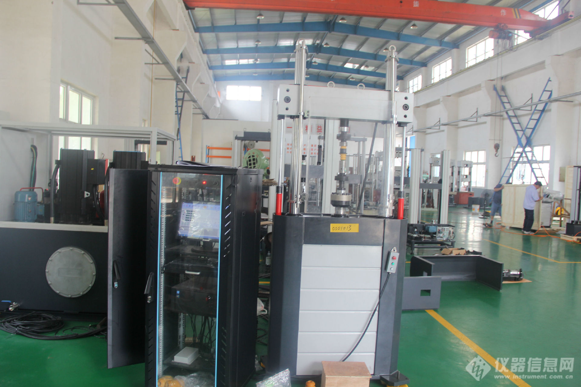 参观过程中,在厂房一角,有台疲劳试验机产品正在试验运行。据林新生介绍,这台设备已经与客户完成了交付,现在运行的也是客户自己的试验,即汽车悬架上橡胶弹性元件的60万次疲劳试验。放在这里是因为客户新的实验室还未建好,所以专门给他们拉了一个电表,这段时间就暂时放在这里进行试验了。同时得知,由于该设备比较适用方便,该客户已经购置了6台。